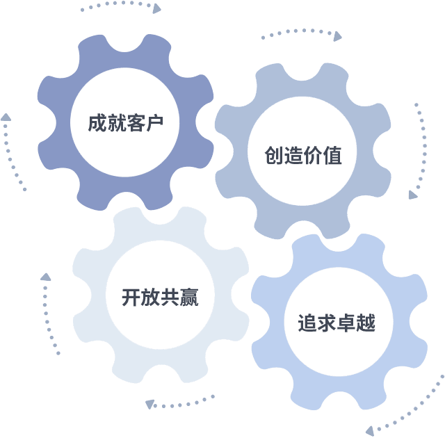 成就客户是一切决策的出发点,,,创造价值是衡量所有工作的标准,,,,追求卓越是我们做事做人的态度,,开放共赢是我们的格局也是最终的结果。。价值观的齿轮环环相扣,,推动着组织里的每个人不断向前。。。。